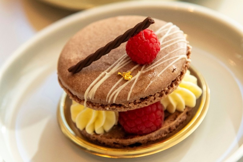 ショコラのマカロンでなめらかなクリームとフランボワーズをサンド。