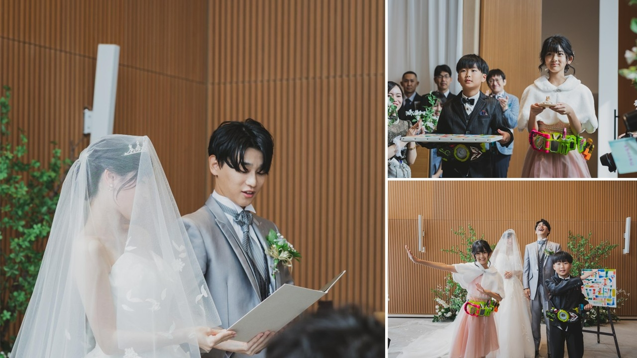 新郎様からプレゼントされた特撮ヒーローのベルトをつけてご入場