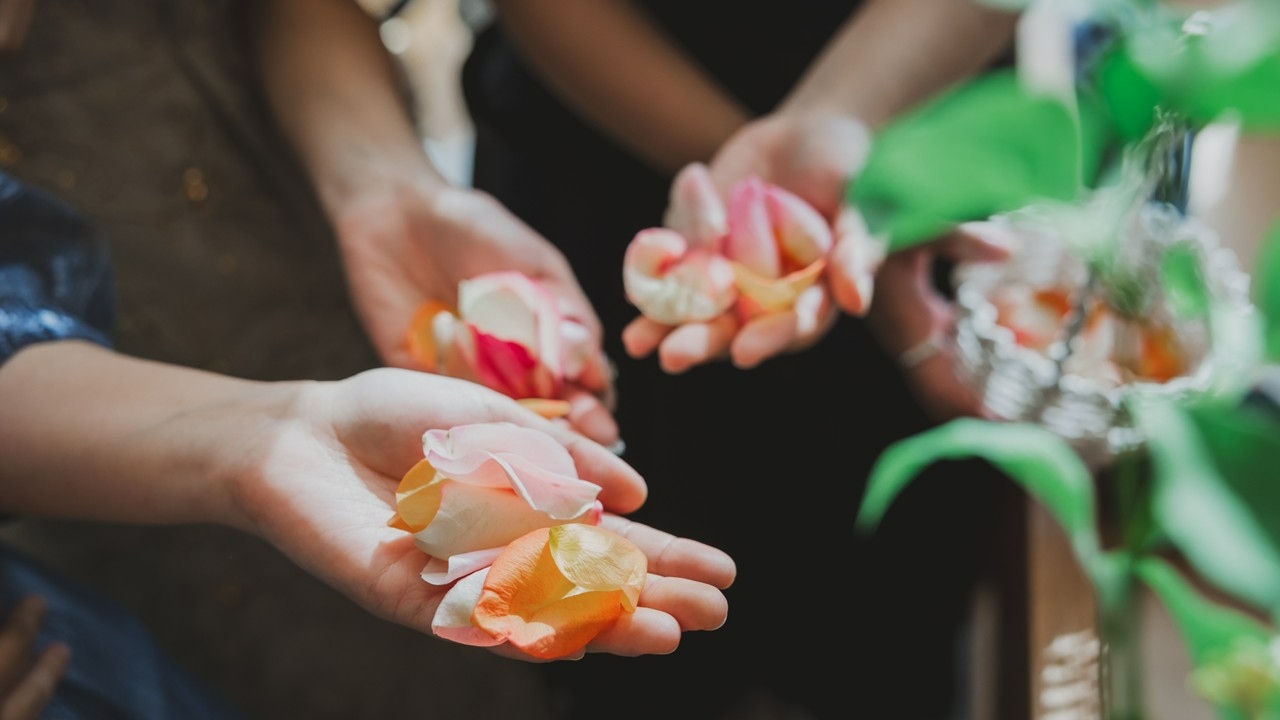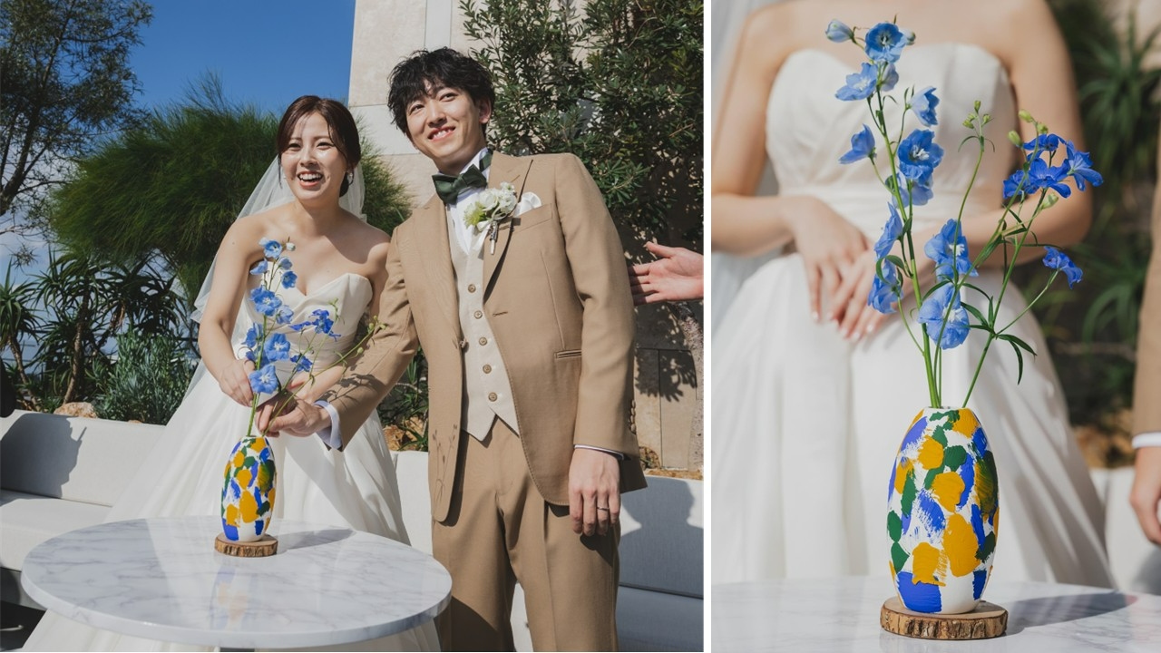 挙式までのお時間に ゲストの皆さまは フラワーベースにデコレーションを